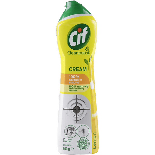 New Cif Lemon Cream, with its fresh citrus scent, is made with 100% natural cleaning particles derived from limestone for a reliable cleaning. This multi-purpose surface cleaner removes 100% of tough dirt for a beautifully clean finish on a range of surfaces. It can be used as a kitchen cleaner and is Cif’s best hob cleaner and best kitchen degreaser for sinks, tiles and taps. It also performs strongly as a bathroom cleaner to clean bathtubs, sinks, and bathroom tiles.