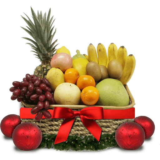 A festive fruit basket, filled with a variety of fresh, seasonal fruits.