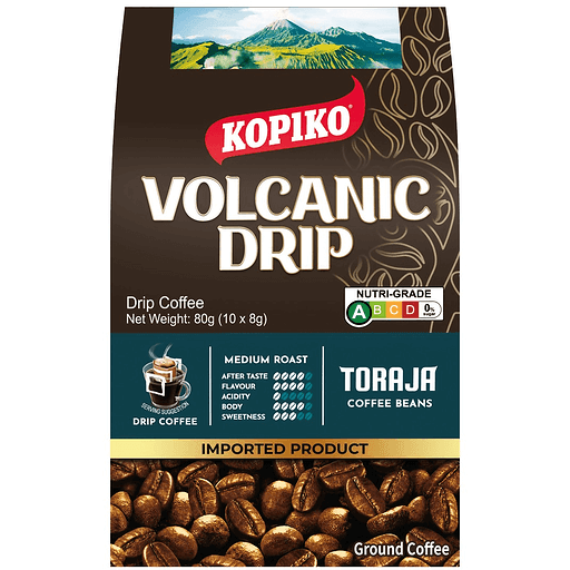 Indulge in the rich, earthy flavors of Kopiko Volcanic Drip Coffee – Toraja, a premium coffee sourced from the highlands of Sulawesi, Indonesia.