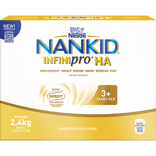 The NEW NANKID® INFINIPRO® HA is a growing-up milk designed for pre-schoolers above 3 years onwards, desveloped based on the best of Nestlé's research on immunity, digestion, metabolism, brain and bone health. It contains our latest expert-designed formula with the new 5 HMO complex, Partially Hydrolyzed Whey Protein, B. Lactis Probiotic, DHA and ARA, to strengthen your child's development in every possible way today anf throughout his life.