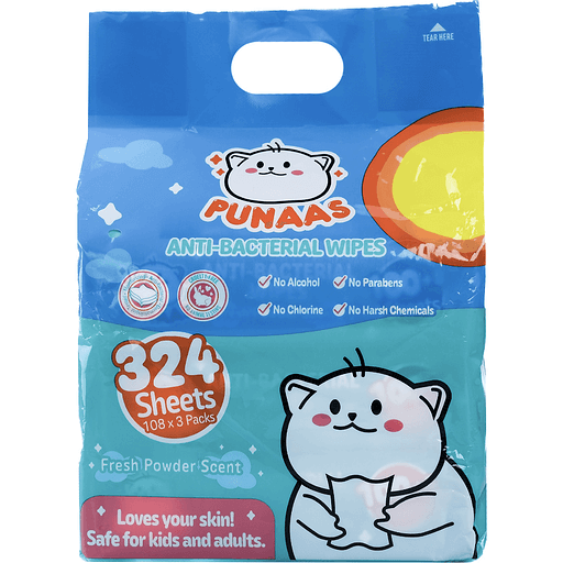 Punaas Anti-bacterial Wipes Fresh Powder Scent | 108s X 3s
