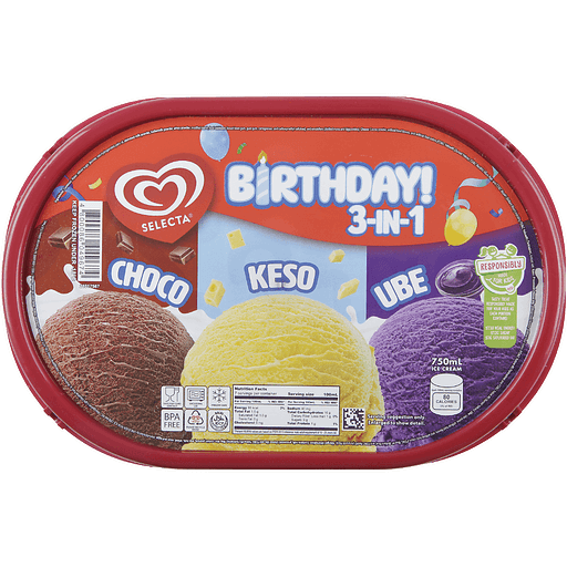 3 flavors in 1L tub featuring Chocolate, Keso and Ube
