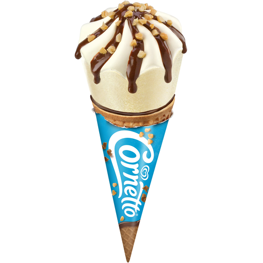 Creamy vanilla ice cream in a golden wafer cone, corwned with a chocolate sauce and topped with crunchy nuts, ending with a crunchy chocolate tip