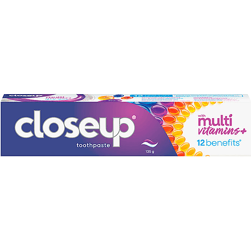 Closeup Toothpaste with 12 Benefits Multivitamins 135g is a premium oral care product designed to provide comprehensive protection for teeth and mouth health. It offers 12 dental health benefits, including fighting plaque, bacteria, cavities, bad breath, yellow teeth, bleeding gums, sensitivity, tartar, enamel erosion, gingivitis, germs, and root cavities. This toothpaste is enriched with vitamins and minerals to enhance oral hygiene.