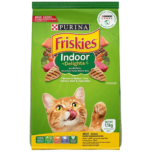 Purina Friskies Indoor Delights Cat Dry Food is a 100% complete and balanced nutrition formulated to promote healthy weight and help control hairballs, with flavors of chicken, salmon, cheese & garden greens.