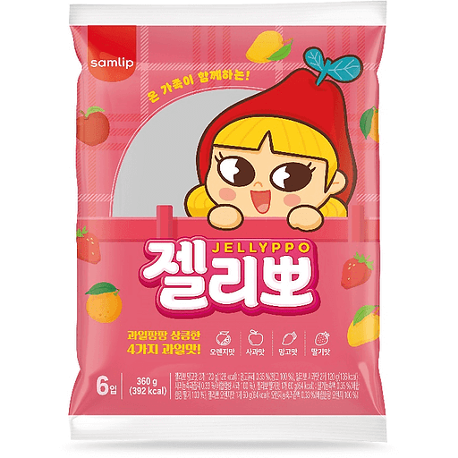 Samlip Jelly Jellyppo is a type of Korean jelly snack, known for its soft and chewy texture. It is available in various flavors and packaging sizes, including a 6-piece pack.
