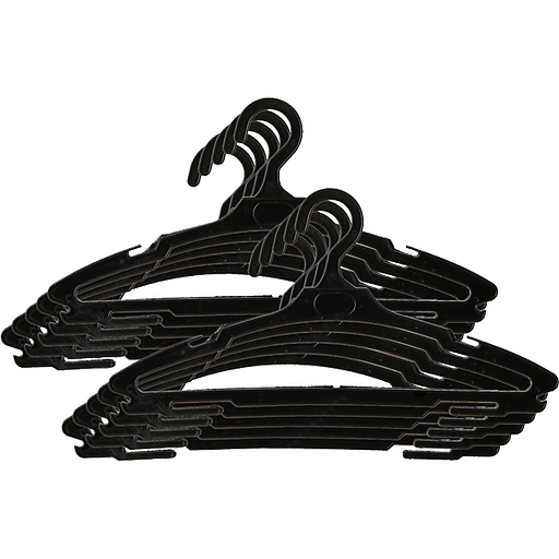 The bottom of these flat hangers is dropped 1" to allow room to hang pants and a coat on the same hanger, saving space